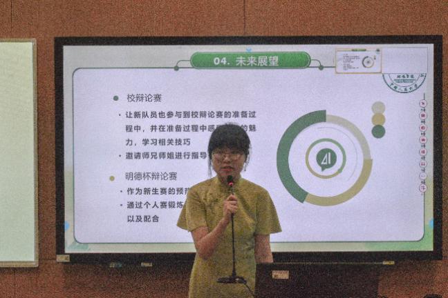 借着火热的招新气氛,辩论队负责人王思睿也向大家发出邀约,她介绍了辩论队基本情况以及即将到来的校辩论赛,欢迎每一位热爱辩论的同学加入到辩论队中。