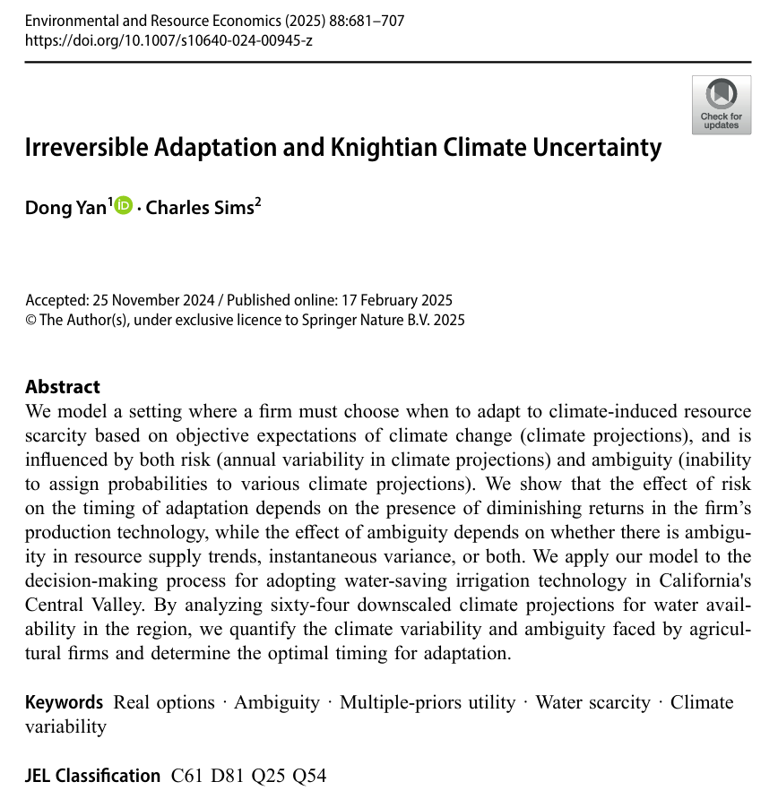 本论文建立了一个理论模型,刻画企业在应对气候诱发的资源稀缺问题时的最优适应时机选择。研究发现:气候风险(年际波动)对适应时机的影响取决于企业生产技术的边际报酬结构;气候模糊性(对未来水资源趋势及其方差的不可知性)则通过不同机制影响企业决策;二者交互作用下,企业更倾向于延后适应,避免在信息不完备时做出不可逆的投资决策。为验证模型的现实适用性,作者以美国加州中央谷地农业企业采纳节水灌溉技术为案例,基于64条精细化气候投影数据对区域水资源供给的不确定性进行了量化模拟,测算了企业面临的最优适应窗口。