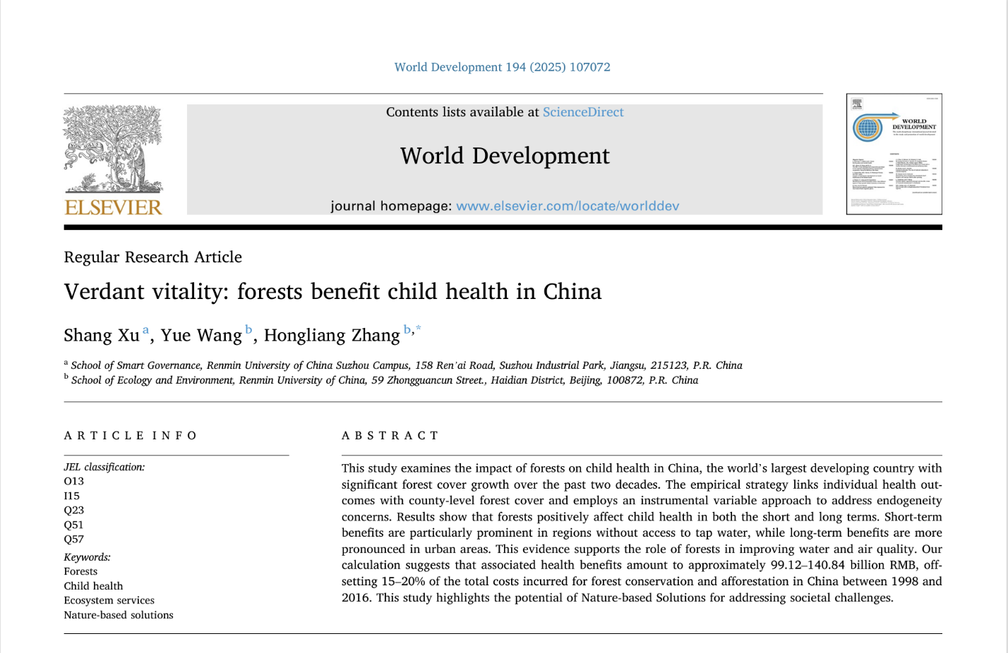 近日,十大体育网站张红亮副教授作为通讯作者,合作研究论文 Verdant vitality: forests benefit child health in China发表在发展研究领域的国际知名期刊 World Development上。论文第一作者为十大体育网站苏州校区智慧治理公司徐上副教授,第二作者为十大体育网站人口、资源与环境经济学硕士毕业生王悦。
