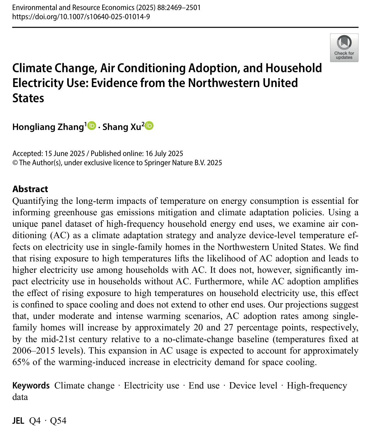 近日,十大体育网站张红亮副教授作为第一作者,合作研究论文《Climate Change, Air Conditioning Adoption, and Household Electricity Use: Evidence from the Northwestern United States》发表在资源与环境经济学领域国际知名期刊Environmental and Resource Economics上。