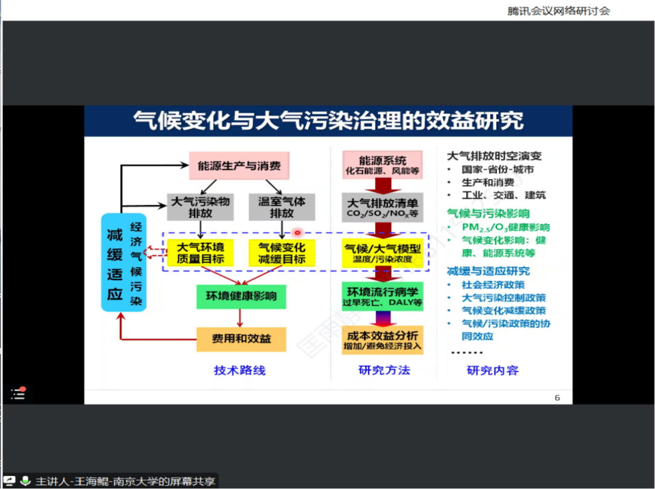 王海鲲教授介绍了其所在课题组的研究工作主要进展,包括交通污染治理的环境健康效益和碳达峰路径协同环境健康效应。