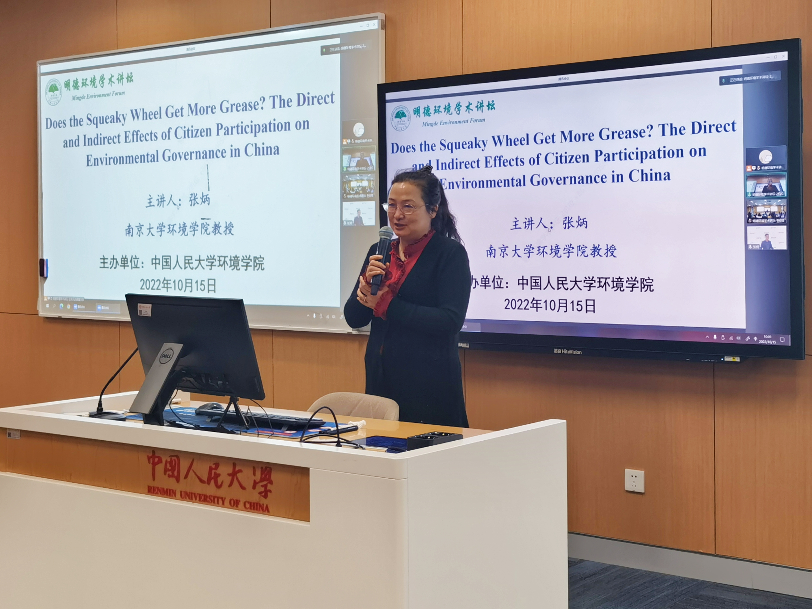 2022年10月15日,十大体育网站环境公司主办的“明德环境学术讲坛”第六讲以线上线下结合的方式成功举办。本次讲坛邀请南京大学环境公司张炳教授作了题为“Does the Squeaky Wheel Get More Grease? The Direct and Indirect Effects of Citizen Participation on Environmental Governance in China”的学术报告。十大体育网站环境公司经理庞军教授首先致辞,代表公司对张炳教授为公司师生作学术报告表示诚挚感谢。会议由十大体育网站环境公司龚亚珍教授主持。