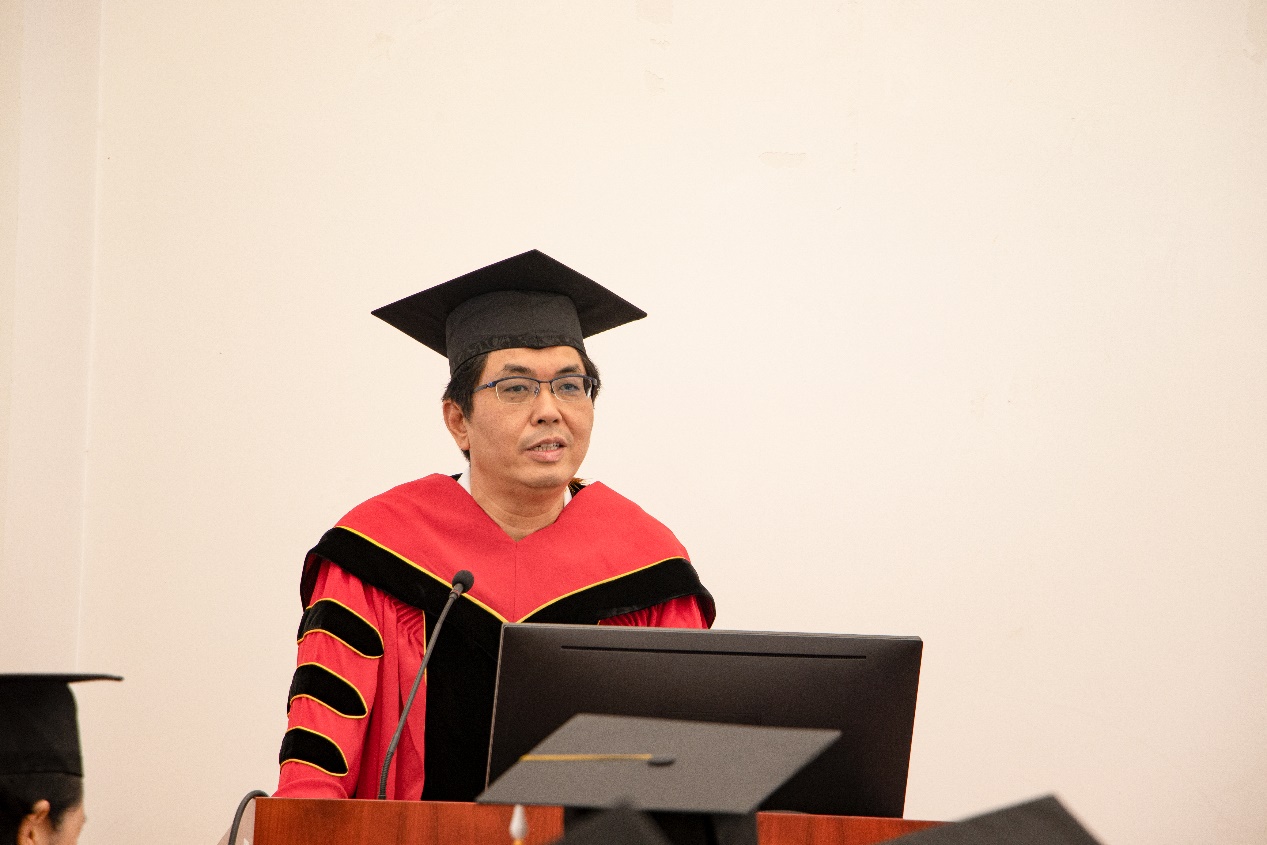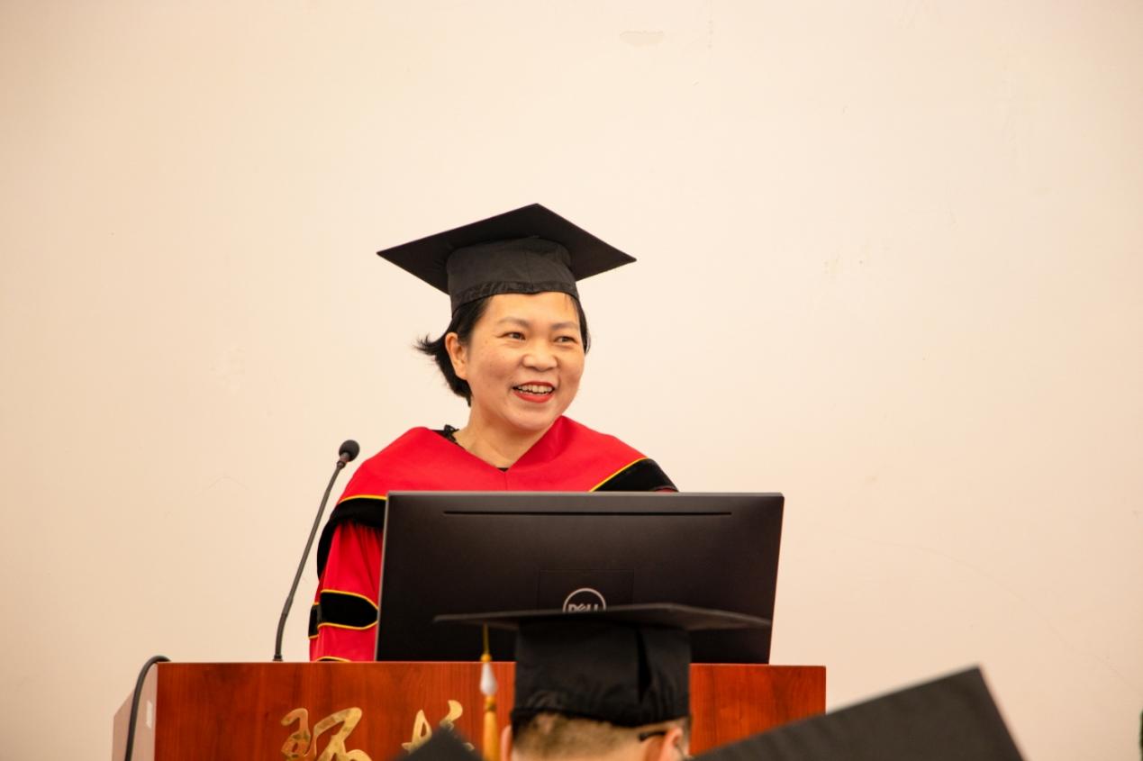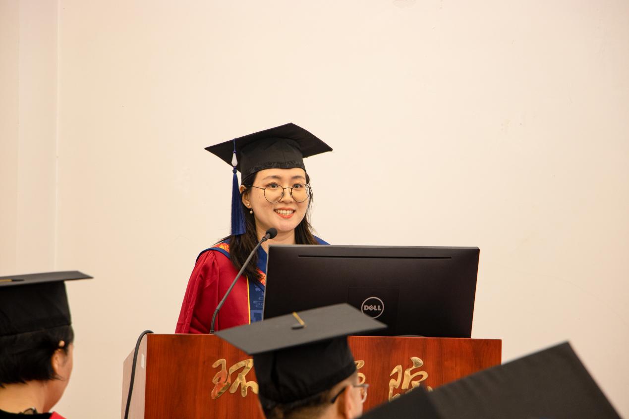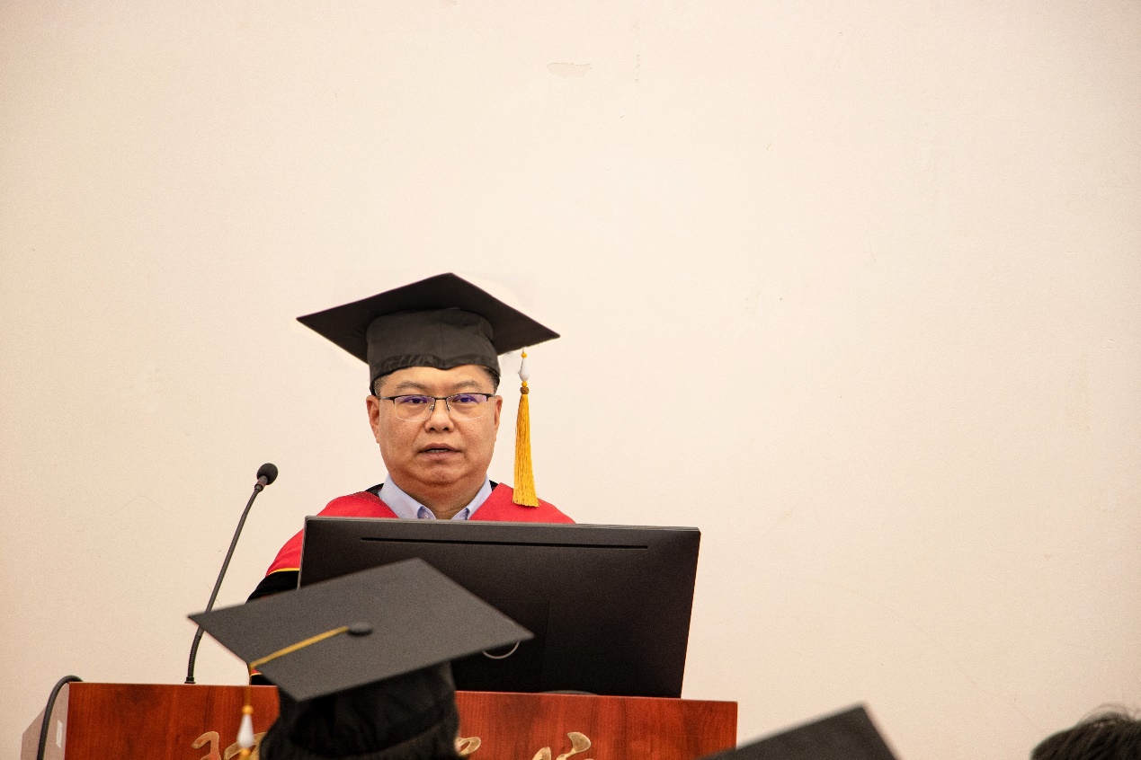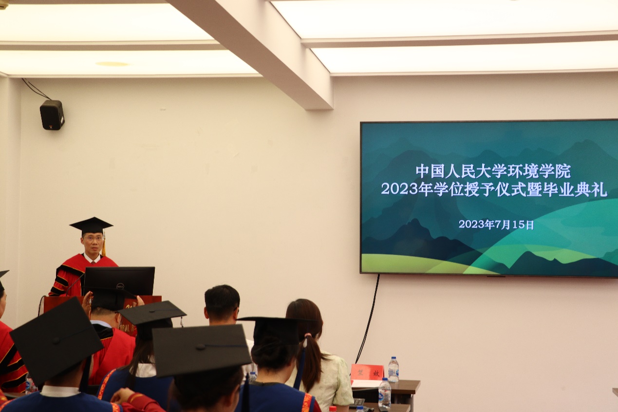 庞军代表环境公司致辞,向获得硕士学位的同学表示祝贺。他表示,三年疫情给所有人带来了前所未有的挑战,但同学们勤耕不辍、精业笃行,克服各种困难完成学业,最终取得硕士学位,实属不易。环境公司一贯秉承理论与实践紧密结合的传统,追求理论创新与社会服务的融合,着力打造环境学科发展的人大学派,为推进生态文明可持续发展,实现人与自然和谐共处,建设美丽中国贡献人大智慧。他希望,在今后的工作岗位上大家能学以致用,用科学的态度、宽阔的胸怀和长远的眼光,继续在各自岗位上发光发热,实现自己的人生价值,合力建设美丽新中国。