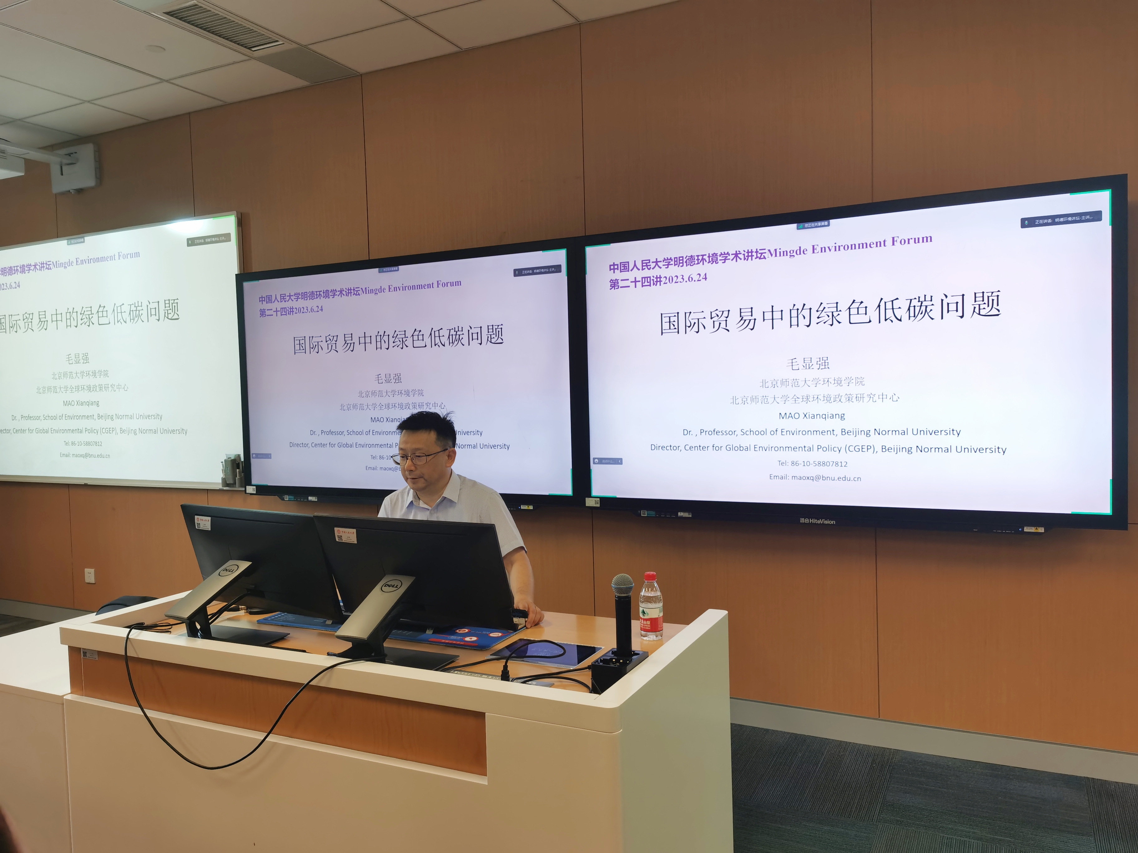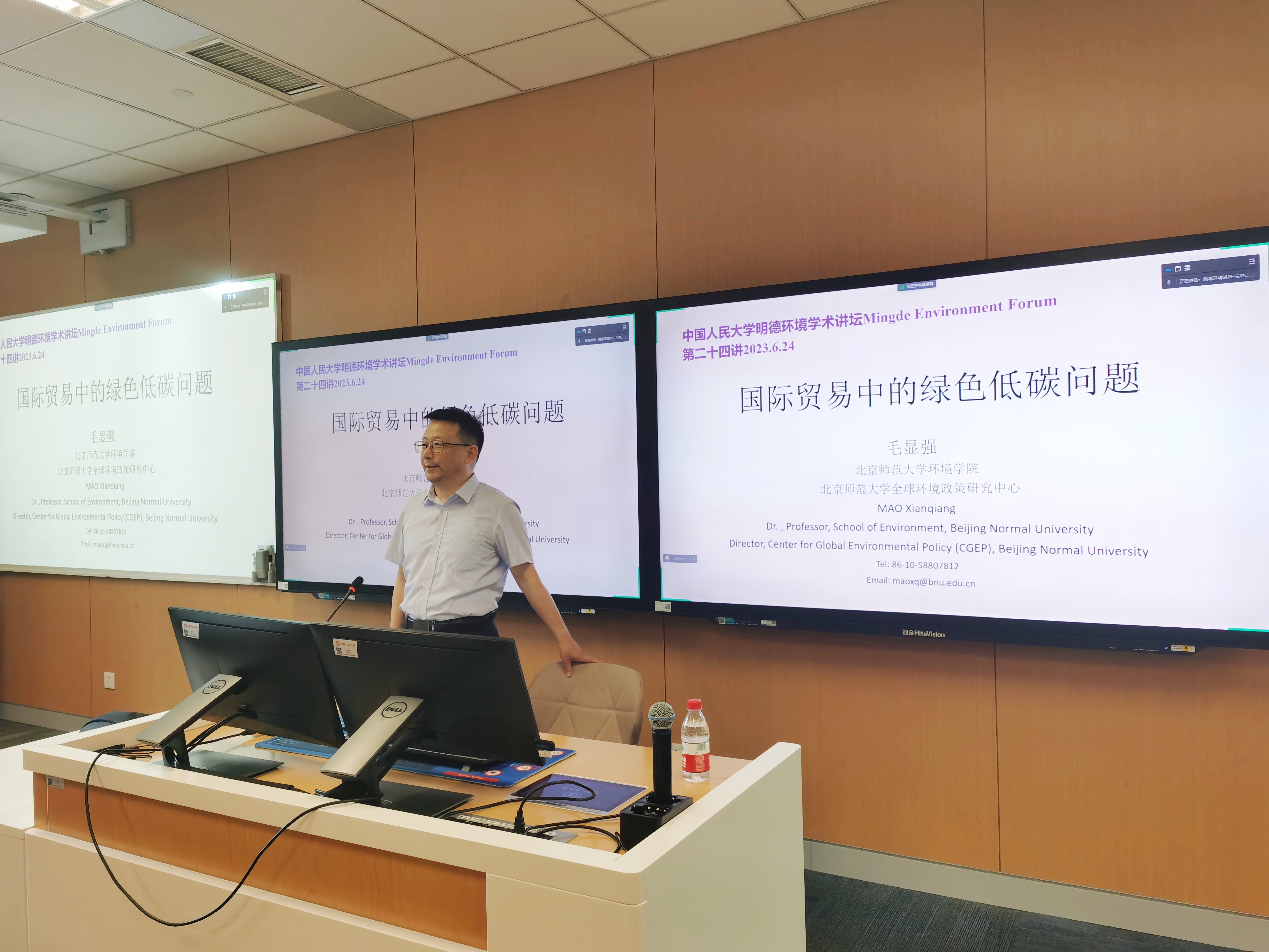 2023年6月24日,十大体育网站环境公司主办的“明德环境学术讲坛”第二十四讲以线上线下结合的方式成功举办。本次讲坛邀请北京师范大学环境公司毛显强教授作了题为“国际贸易中的绿色低碳问题”的学术报告。十大体育网站环境公司经理庞军教授首先致辞,代表公司对毛显强教授为公司师生作学术报告表示诚挚感谢,表达了公司对明德环境学术讲坛的高度重视,并对参会师生在交流学习过程中能够有所收获提出了殷切期望。会议由十大体育网站环境公司昌敦虎副教授主持。
