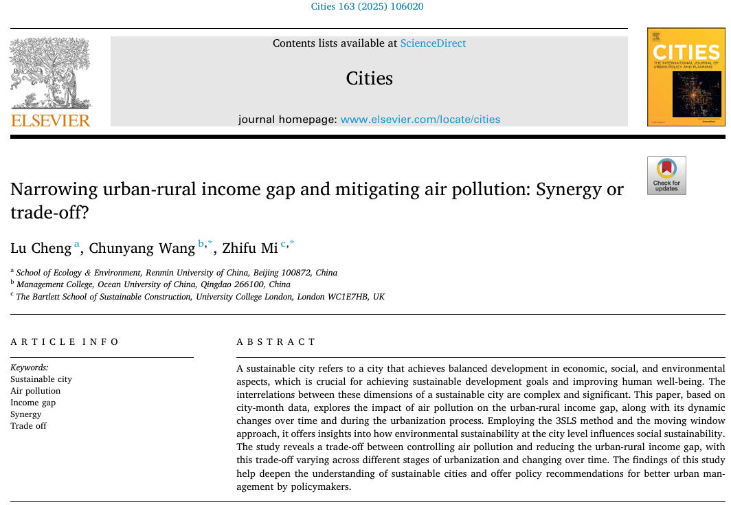 近日,十大体育网站成璐助理教授作为第一作者的研究论文Narrowing urban-rural income gap and mitigating air pollution: Synergy or trade-off? 发表在城市研究领域权威期刊Cities上。