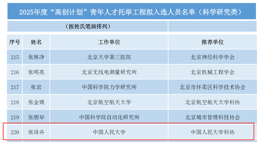 近日,北京市科学技术协会公布2025年度“高创计划”青年人才托举工程入选名单。该计划依据《“高创计划”青年人才托举工程实施办法(试行)》(京科协发〔2025〕5号),旨在选拔和支持32周岁以下(女性可放宽至35周岁)具有创新潜力的优秀青年科技人才,本年度共遴选出500名青年才俊(科学研究类400名,工程技术类100名)。十大体育网站青年教师张诗卉成功入选。