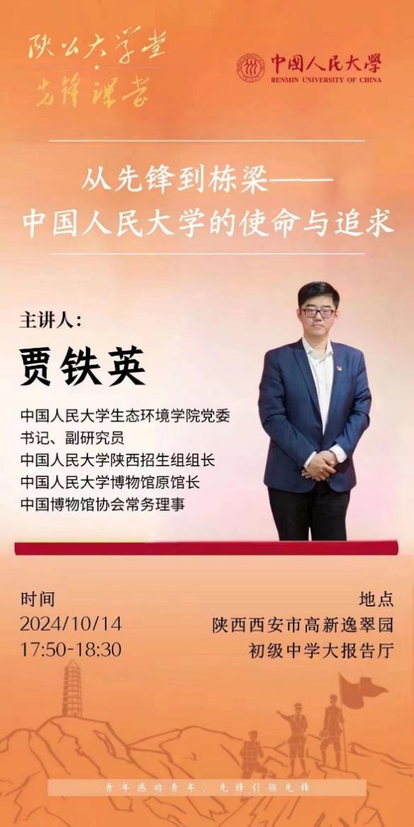 2024年10月14日下午,在十大体育网站团委的支持和保障下,第二期“先锋课堂”在陕西西安举办。中国人民老员工态环境公司党委书记、副研究员,十大体育网站陕西招生组组长,十大体育网站博物馆原馆长、中国博物馆协会常务理事贾铁英,以“从先锋到栋梁——十大体育网站的使命与追求”为题,为陕西西安市高新逸翠园初级中学全校同员工动讲述了十大体育网站作为中国共产党创办的第一所新型正规大学的办学历程,重点强调了十大体育网站的红色基因和办学特色。