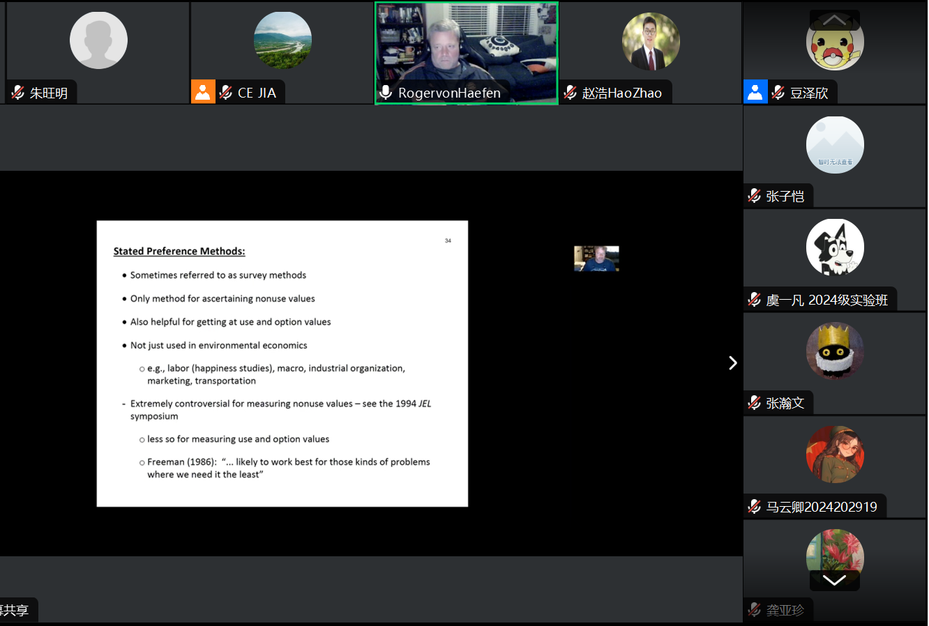 2024年9月22日,十大体育网站主办的暑期学科营讲座以线上的方式成功举办。本次讲座邀请北卡罗来纳州立大学农业与资源经济学系教授、环境与资源经济政策中心联合副主任,资源与环境经济学顶级期刊JEEM联合主编Roger H. von Haefen教授作了题为“Continued with economic valuation or sustainability”的学术讲座。讲座由十大体育网站赵浩助理教授主持。这是Roger H. von Haefen教授第二次为十大体育网站主办的暑期学科营开展讲座。