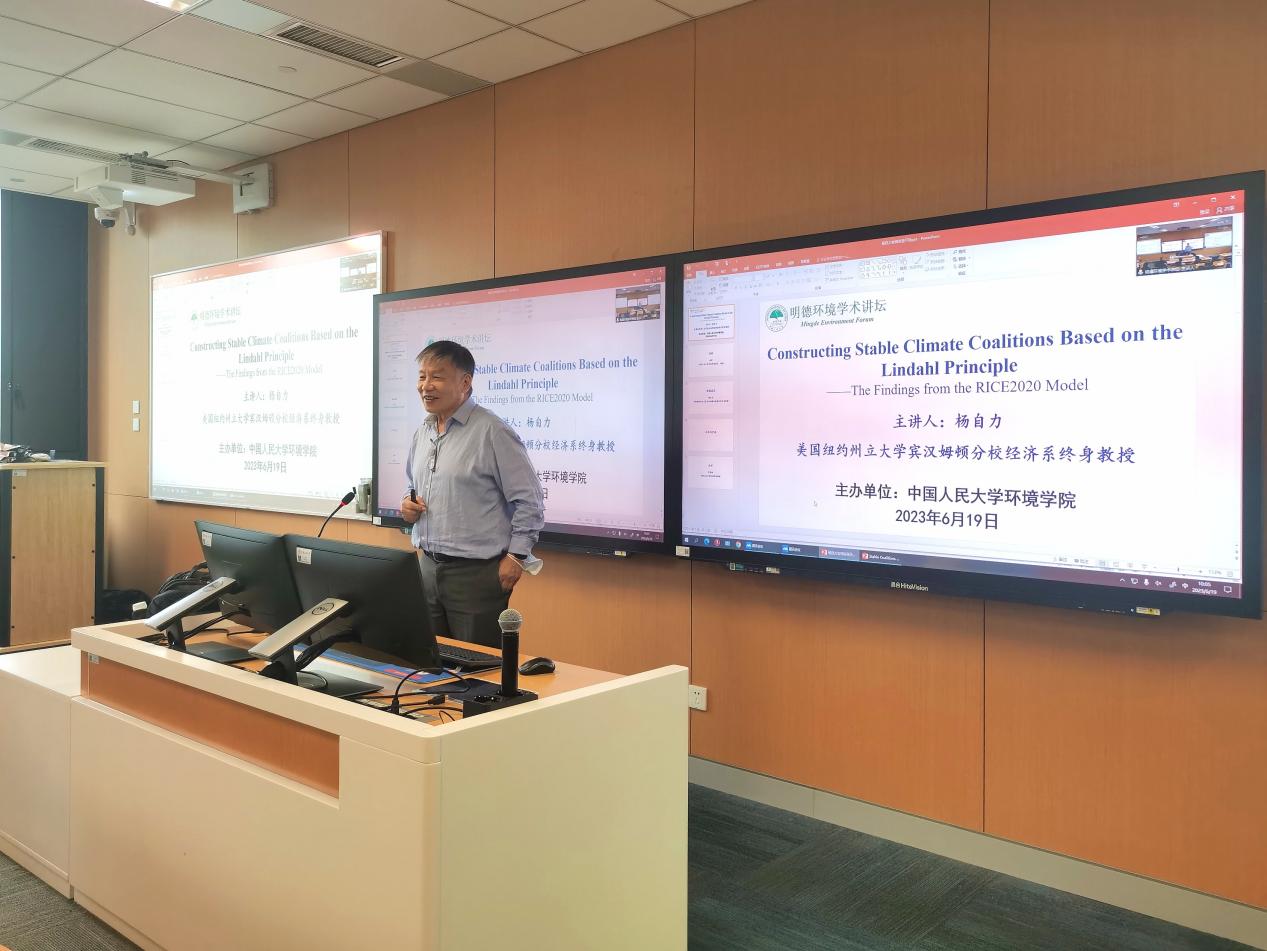 2023年6月19日,十大体育网站环境公司主办的“明德环境学术讲坛”第二十三讲以线上线下结合的方式成功举办。本次讲坛邀请美国纽约州立大学宾汉姆顿分校经济系终身教授杨自力教授线下作了题为“‘Constructing Stable Climate Coalitions Based on the Lindahl Principle”的学术报告。十大体育网站环境公司经理庞军教授首先致辞,代表公司对杨自力教授为公司师生作学术报告表示诚挚感谢,并对参会师生在交流学习过程中能够有所收获提出了殷切期望。会议由十大体育网站环境公司昌敦虎副教授主持。