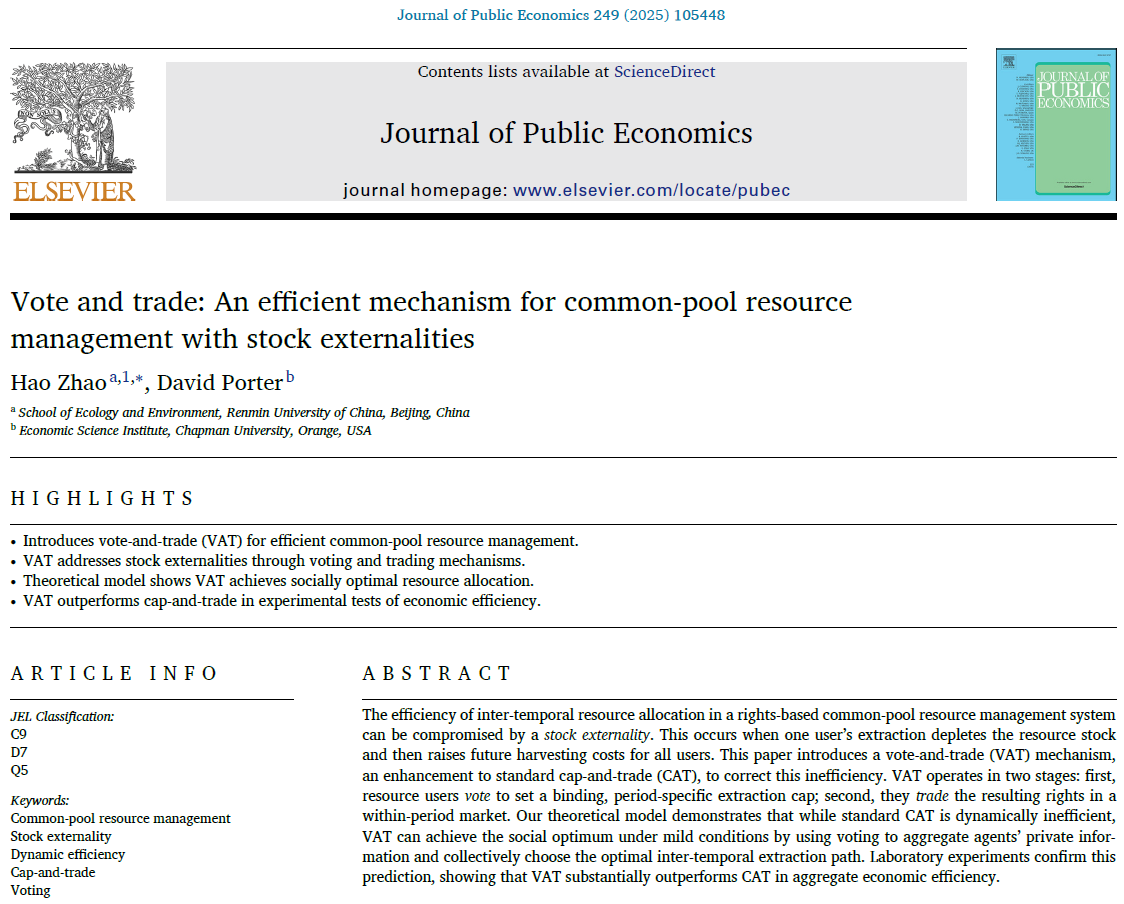 近日,十大体育网站赵浩助理教授以第一作者和通讯作者身份在公共经济学领域国际顶级期刊Journal of Public Economics 发表题为“Vote and Trade: An Efficient Mechanism for Common-Pool Resource Management with Stock Externalities” 的学术论文。本论文另一位合作者是来自Chapman大学经济科学研究所的David Porter教授。