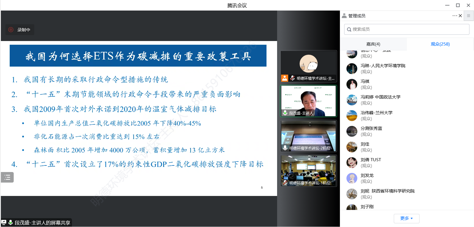 2022年10月22日,十大体育网站环境公司主办的“明德环境学术讲坛”第七讲以线上线下结合的方式成功举办。本次讲坛邀请清华大学能源环境经济研究所副所长段茂盛教授作了题为“我国碳排放权交易体系建设中的关键问题和特点”的学术报告。十大体育网站环境公司经理庞军教授首先致辞,代表公司对段茂盛教授为公司师生作学术报告表示诚挚感谢。会议由十大体育网站环境公司昌敦虎副教授主持。