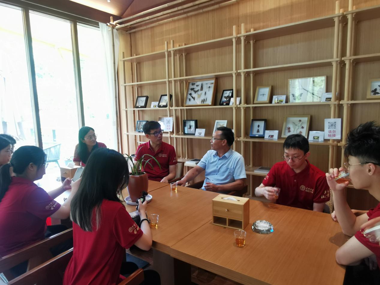 7月9日下午,师生调研团前往桐木村,走访金骏眉发源地骏德茶厂,实地考察生态产品价值实现的创新实践。在茶香氤氲的茶室里,金骏眉首泡制作人梁骏德先生与传承人梁天雄先生向调研团生动讲述了创制金骏眉的传奇历程,"从萎凋、揉捻到炒制、烘干的反复试验与改进,最终成就了这一缕松香",梁骏德先生这段饱含匠心的创业故事让在场师生深刻感受到传统工艺与现代创新的完美融合。梁天雄先生向师生详细介绍了桐木村优质的生态条件,讲述了金骏眉的品牌故事。他指出,"这些天然屏障和独特的小气候,造就了茶叶不可复制的‘松烟香、桂圆味’,这正是武夷山赐予我们最珍贵的生态馈赠。"在品鉴环节,师生们通过琥珀透亮的茶汤、馥郁持久的香气,切身感受到"骏德标准"如何将生态优势转化为品质优势。感悟到:传统工艺的传承需要与时俱进的创新精神;体会到:严格的生态保护不仅成就了茶叶的独特品质,更通过品牌溢价实现了生态价值的市场化转化,这正是'绿水青山就是金山银山'理念的生动诠释。茶厂"古法为基、标准为要、生态为本"的发展模式,为生态产品价值实现提供了可复制的成功范例。
