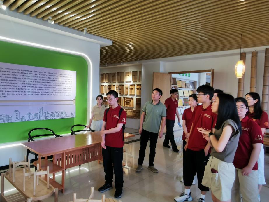 7月10日上午,调研团来到邵武市"竹立方"生态科创馆,实地考察当地竹产业在生态产品价值实现方面的探索实践。在工作人员详细介绍下,师生们了解到邵武市依托丰富的毛竹资源,通过技术创新延伸全产业链,开发出竹板材、竹家具等系列产品,实现了从原材料到终端产品的全链条开发。工作人员详细地讲解了竹材的优点——生长快、韧性高、固碳强、可降解,并介绍当地通过全产业链创新破解行业难题:前端以碳化改色技术提升竹材稳定性,后端开发竹家具、竹纤维快消品等高附加值产品,推动竹产业向家居、建材、时尚领域渗透。工作人员重点介绍了竹材在"以竹代塑"方面的应用前景,展示了竹制餐具、日用品等环保替代产品。邵武市依托国家“以竹代塑”政策支持及出口绿色壁垒优势,通过建立竹产业科创平台,整合研发、设计、生产等环节,推动生态优势转化为经济优势,让“小竹子”串联起低碳经济的大未来。这一实践为生态产品价值实现提供了有益参考。