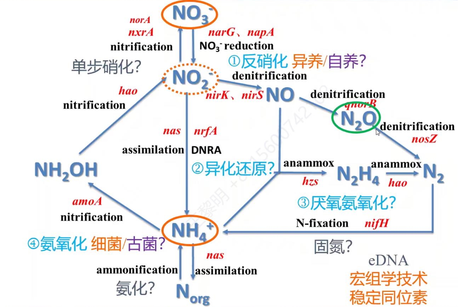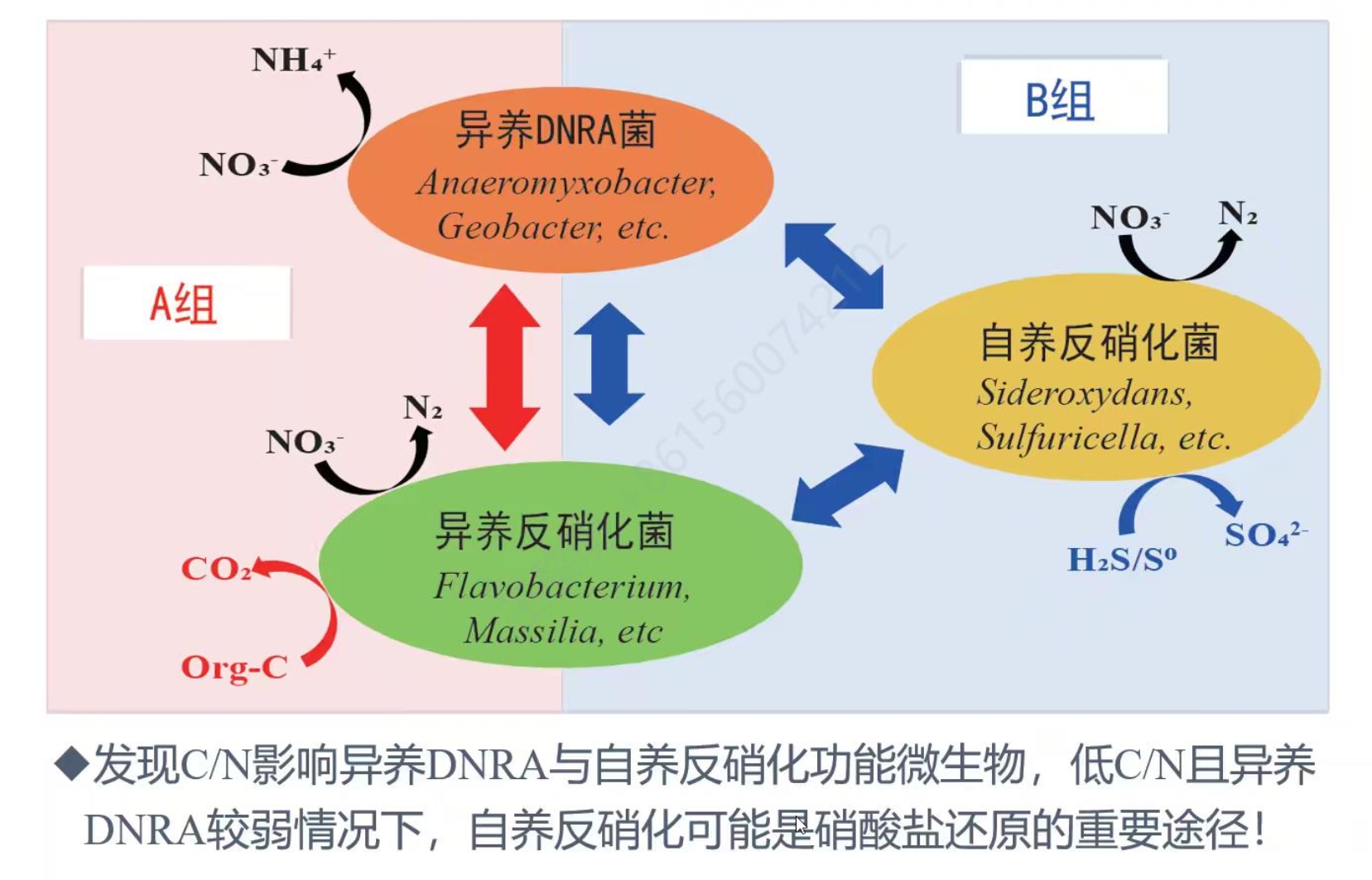 通过对已有研究的梳理,最终发现对湿地微生物氮转化过程、速率通量及贡献进行深入研究具有重要的科学意义及实践价值。在河湖湿地硝酸盐还原过程响应机制方面,籍教授为同学们细致地介绍了基于同位素示踪、同位素分馏、环境DNA及宏基因组等先进技术对微生物氮转换过程进行研究的研究思路和研究成果。主要结论包括:不同异化还原(DNRA)湖泊的主导菌群和主导过程(异养反硝化/自养反硝化)不同,可能与水体中的碳氮比有关;长期输入硫促进自养反硝化抑制DNRA过程,而单质硫共同促进自养反硝化和DNRA过程,明确了Thiobacillus等为自养反硝化和DNRA关键物种,长期输入硫,N2O积累量提高12.9倍;发现微生物对铁氧化硝酸盐还原贡献占60-75%,且铁自养反硝化>26%,并明确了铁自养反硝化的主要菌群。此外,籍教授还与大家分享了海岸带湿地古菌和细菌氨氧化贡献、人工湿地氮转化功能群组调控机制等方面的前沿研究进展。