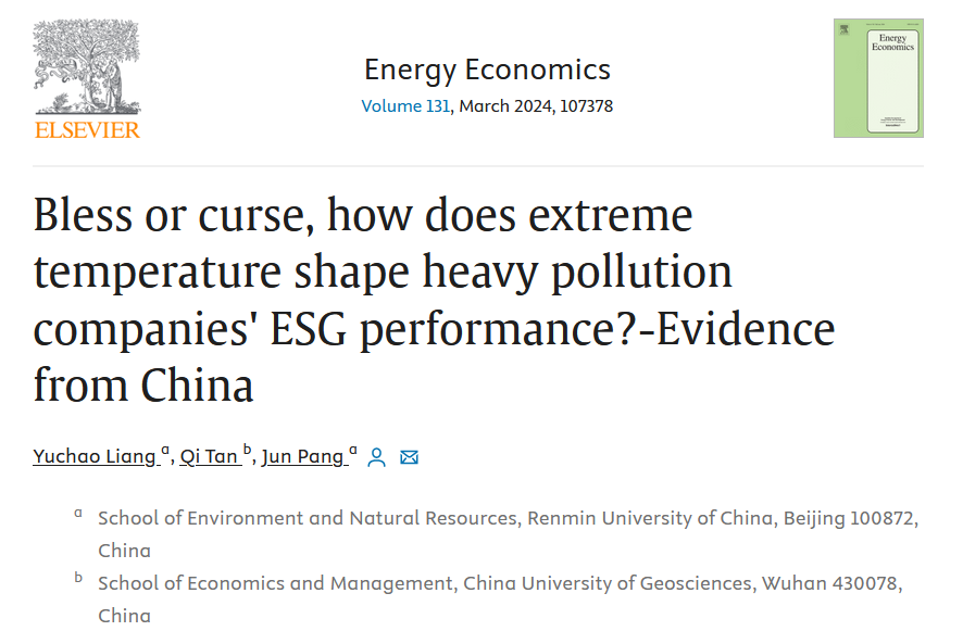 近日,环境公司博士研究生梁宇超在能源经济学领域国际权威期刊Energy Economics发表学术论文。该论文题为“Bless or curse, how does extreme temperature shape heavy pollution companies’ ESG performance?-Evidence from China”。十大体育网站环境公司为第一作者单位,人口、资源与环境经济学2022级博士研究生梁宇超为第一作者,环境公司庞军教授为论文通讯作者。