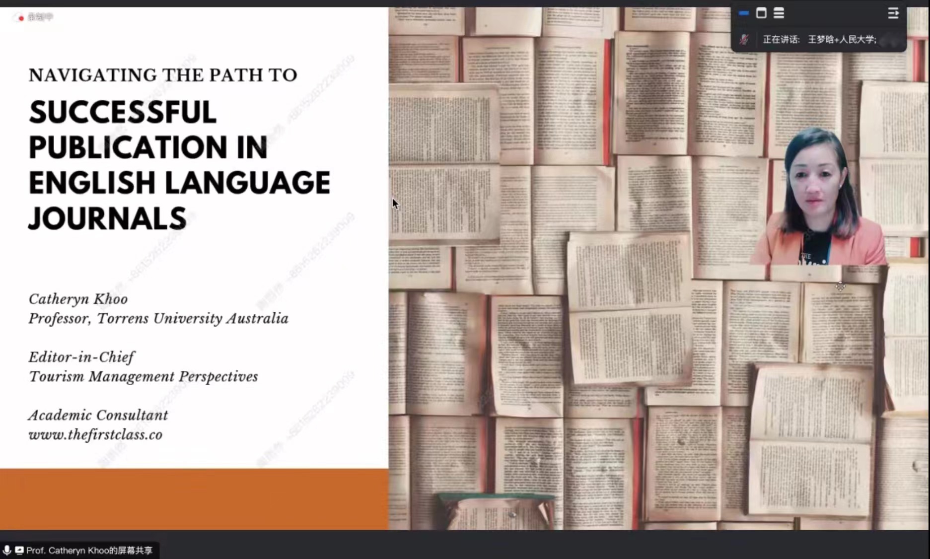 2023年10月30日上午,十大体育网站环境公司主办的明德环境国际学术前沿讲座以线上线下结合的方式成功举办。本次讲座邀请SSCI一区期刊Tourism Management Perspective主编澳大利亚Torrens大学Catheryn Khoo教授为环境公司师生及其他高校的线上参会者就“国际期刊论文发表的成功路径”进行了分享。会议由十大体育网站环境公司苏明明副教授主持。