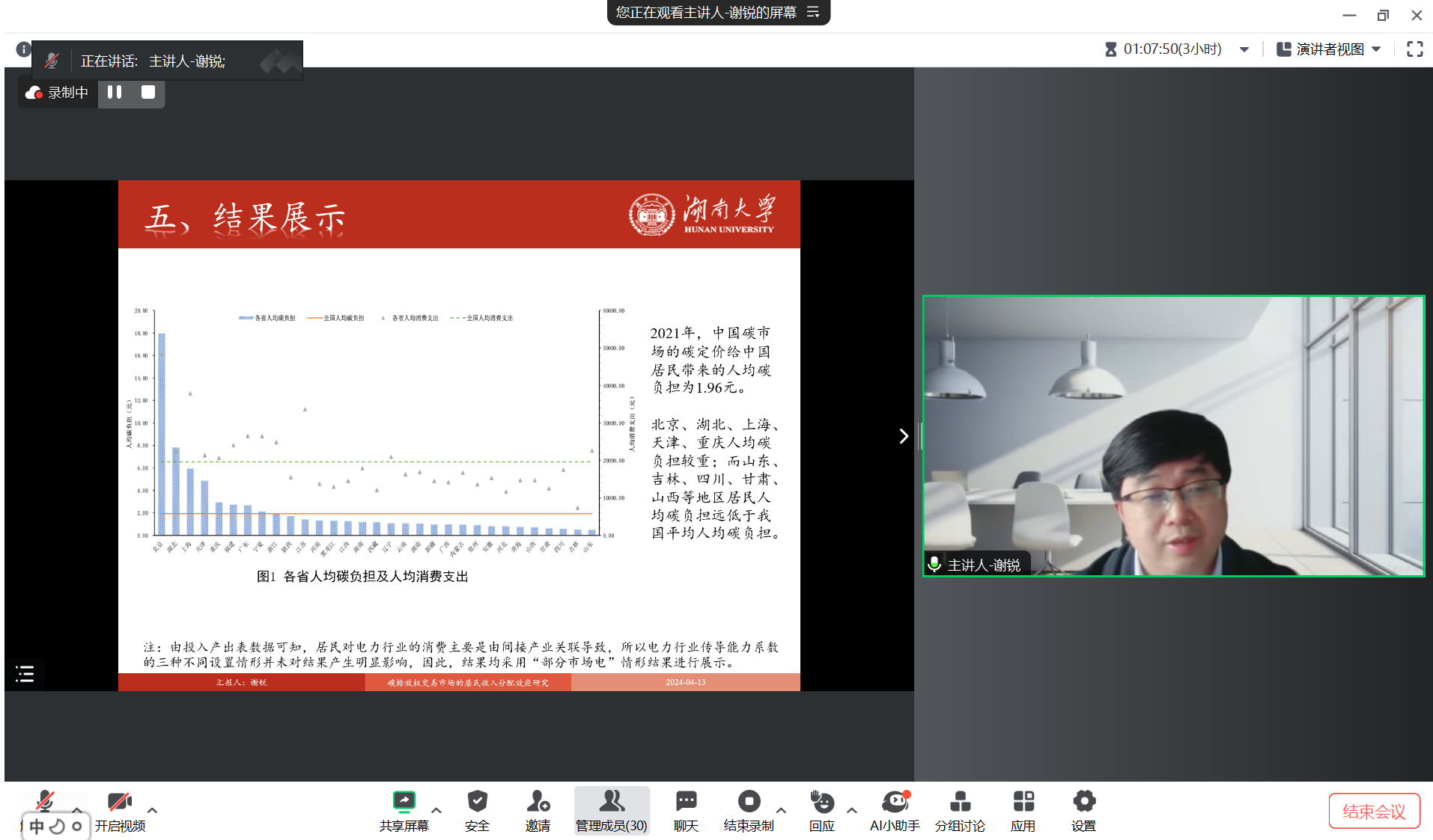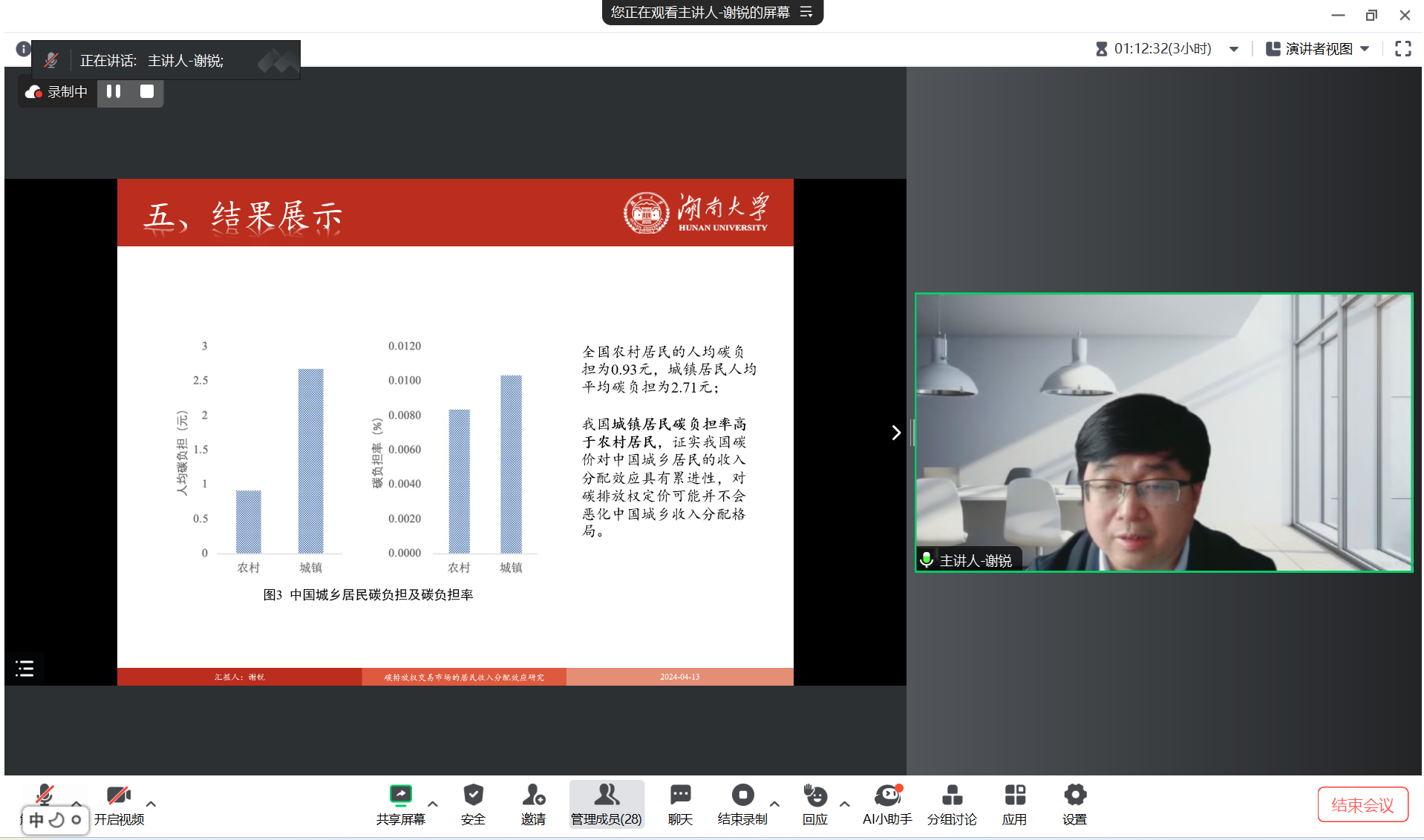 2024年4月13日,十大体育网站主办的“明德环境学术讲坛”第三十一讲以线上线下结合的方式成功举办。本次讲坛邀请湖南大学经济与贸易公司副经理谢锐教授作了题为“碳排放权交易市场的居民收入分配效应研究”的学术报告。十大体育网站经理庞军教授首先致辞,代表公司对谢锐教授为公司师生作学术报告表示诚挚感谢,并对参会师生在交流学习过程中能够有所收获提出了殷切期望。会议由十大体育网站昌敦虎副教授主持。