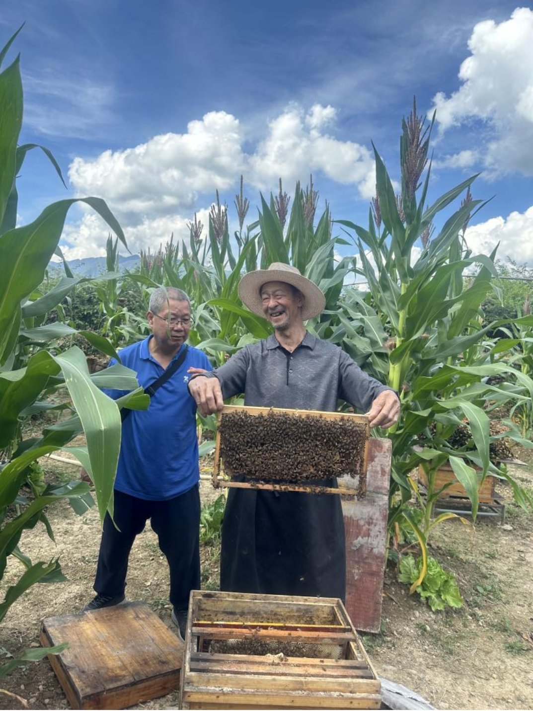 随后,在何科长的带领下,调研团前往蜂农家中进行实地探访。蜂农热情地介绍了院子中的新型蜂箱、玉米地与山泉水源,满怀自豪地向大家展示自家养蜂成果。“廛居何似山居乐?”——这是同学们走访时最真挚的感受,大家纷纷表达对梵净山间寄情山野的惬意生活的向往。