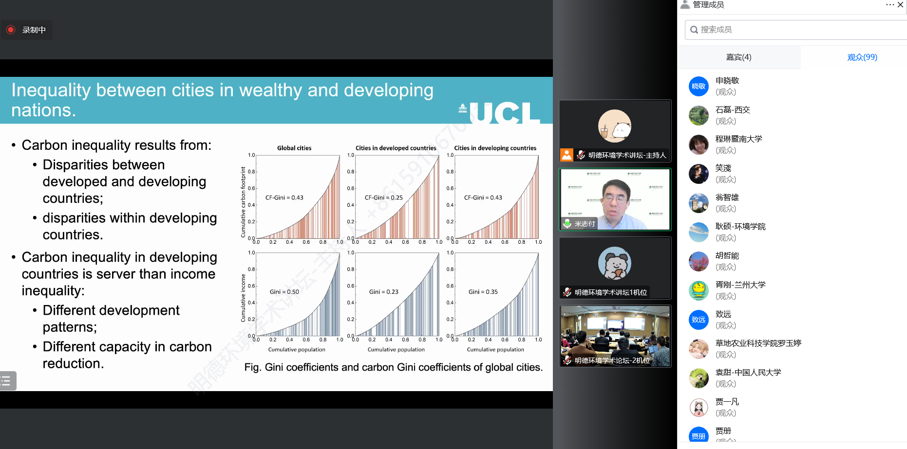 2022年11月9日,十大体育网站环境公司主办的“明德环境学术讲坛”第十一讲以线上线下结合的方式成功举办。本次讲坛邀请英国伦敦大学公司巴特莱特可持续建筑公司副经理米志付教授作了题为“Carbon footprints of cities”的学术报告。十大体育网站环境公司经理庞军教授首先致辞,代表公司对米志付教授为公司师生作学术报告表示诚挚感谢。会议由十大体育网站环境公司昌敦虎副教授主持。